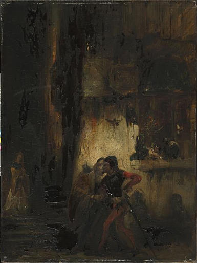 groupe de figures (Faust, Méphistophélès, femme, Marguerite, épée, chat)