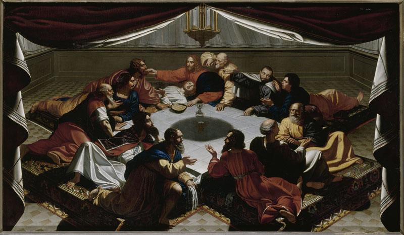 scène biblique (Cène, lit, table) ; effet de tissu ; pavement ; lanterne