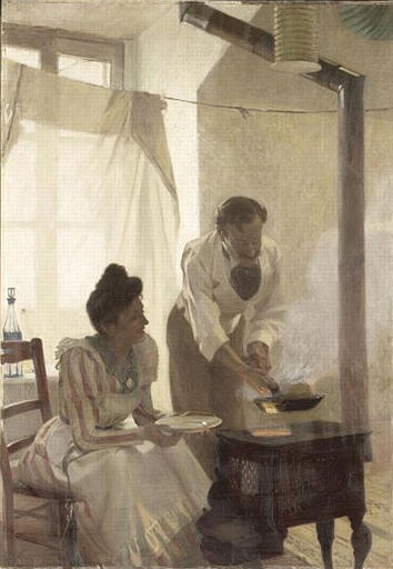 groupe de figures (femme, assis, de profil, bijou, homme, en pied, de face, poêle, préparation des aliments : crêpe) ; lanterne ; bouteille ; verrerie