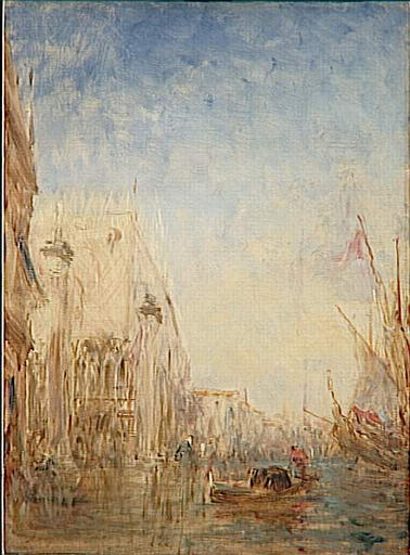 paysage (Italie, Venise, ville, canal, gondole, palais, arcade, colonne, statue)