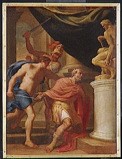 scène mythologique (Priam, agenouillé, statue : divinité, prière : paganisme, meurtre, mort par le fer, homme, palais : intérieur)