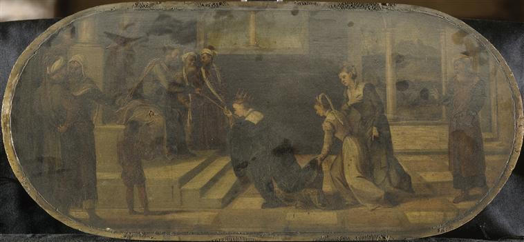scène biblique (Assuérus, trône, Esther, couronne, agenouillé, femme, serviteur, palais : intérieur) ; fond de paysage
