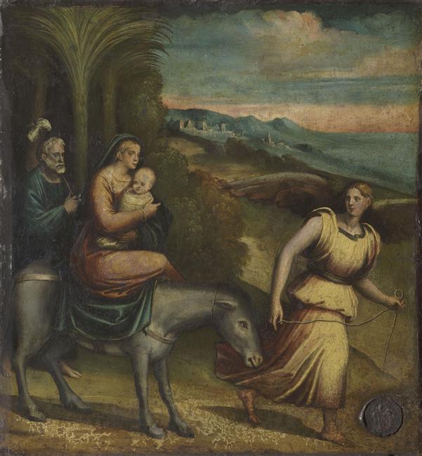 scène biblique (Fuite en Egypte, ange) ; fond de paysage (palmier) ; ville ; fortification