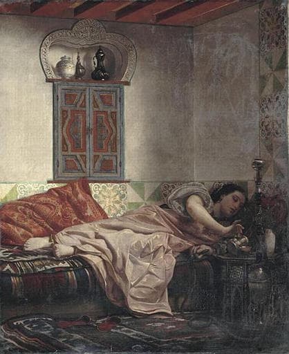 figure (Juif, Alger, Algérien, couché, fumeur, nudité : pied, bijou) ; vue d'intérieur (à l'orientale, mobilier, revêtement mural : céramique, pot : cuivre, tapis, effet de tissu)