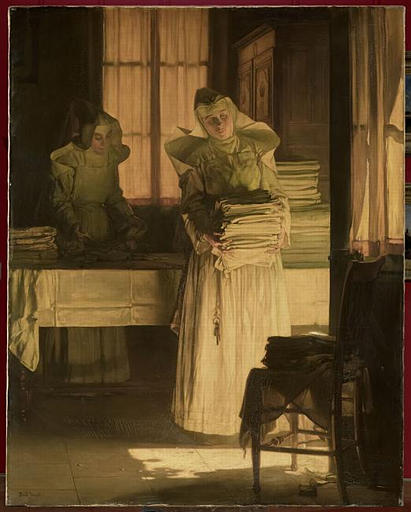 vue d'intérieur (salle, activité domestique : linge de maison, armoire) ; religieuse