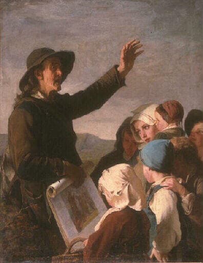 scène (vente, vieux, colporteur : estampe, attroupement, enfant, relation par paroles) ; représentation d'objet (feuillet, objet d'ornement)