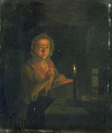 scène (femme, à mi-corps, assis, broderie, travaux d'aiguille, chandelle, livre, intérieur)