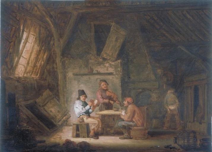 scène (boisson, musique, violon, miction) ; vue d'intérieur (débit de boisson)