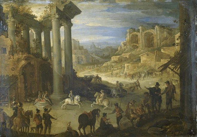 scène (Rome, ?, homme, divertissement, cavalier, cheval, équestre, conversation, boeuf, chien, débit de boisson, enseigne : lunettes, foule) ; fond de paysage (ruines, colonne, maison, ville, arènes, ?, clocher)