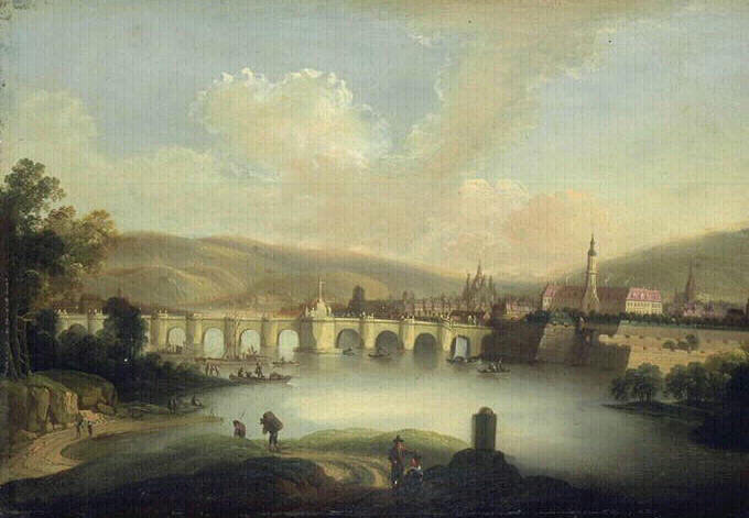 vue d'architecture (ville, Saxe, pont, cours d'eau, bateau, personnage)
