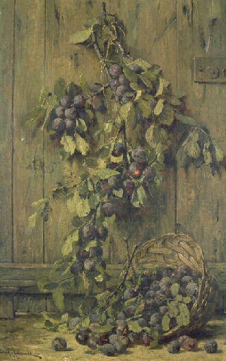 nature morte (branche : prunier, panier, prune)