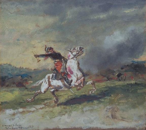 scène historique (blessé, chute, homme, cheval, trompette)