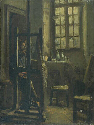 scène (intérieur : atelier d'artiste, chevalet, peintre : réflexion, mobilier, objets divers, fenêtre)