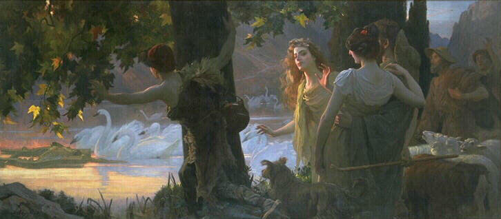 scène mythologique (femme, nappe d'eau, cygne, lyre, berger, mouton, chien, feuillu)