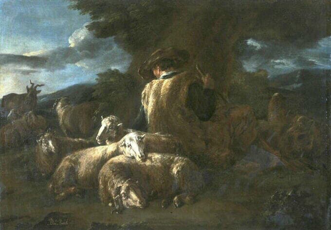 Brandi rappelle par beaucoup d'aspects le peintre danois installé à Rome Bernardo Keil dit Monsu Bernardo. La signature du beau tableau bordelais est la même que sur l'un des deux impressionnants pendants de sujet identique, mais de composition différente, conservés à la Staatsgalerie à Stuttgart, le 'Jeune berger avec son troupeau' ou 'Le Matin' et le 'Berger endormi avec son troupeau et son chien' ou 'Le Soir', ce dernier signé, tout à fait comparables par leur style et leur composition à l'oeuvre bordelaise