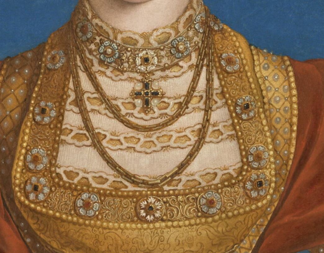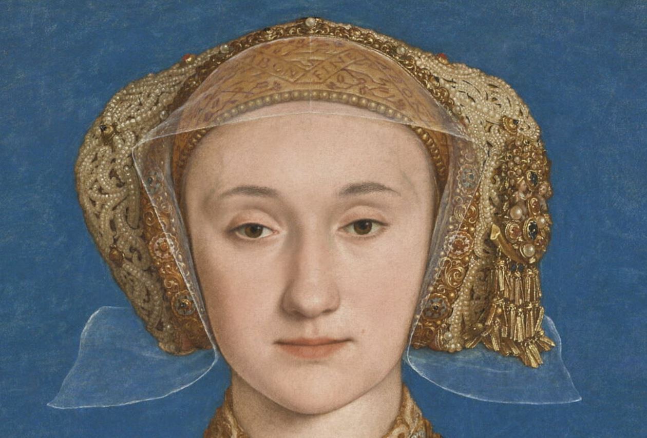 portrait (Anne de Clèves, reine : Angleterre, femme, à mi-corps, de face, robe, coiffe, effet de tissu, orfèvrerie)