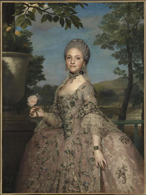 portrait (Parme Marie Louise de, reine : Espagne, en pied, de trois-quarts, effet de tissu) ; fond de paysage