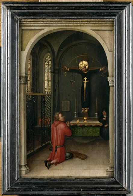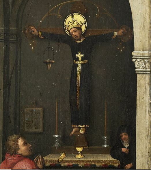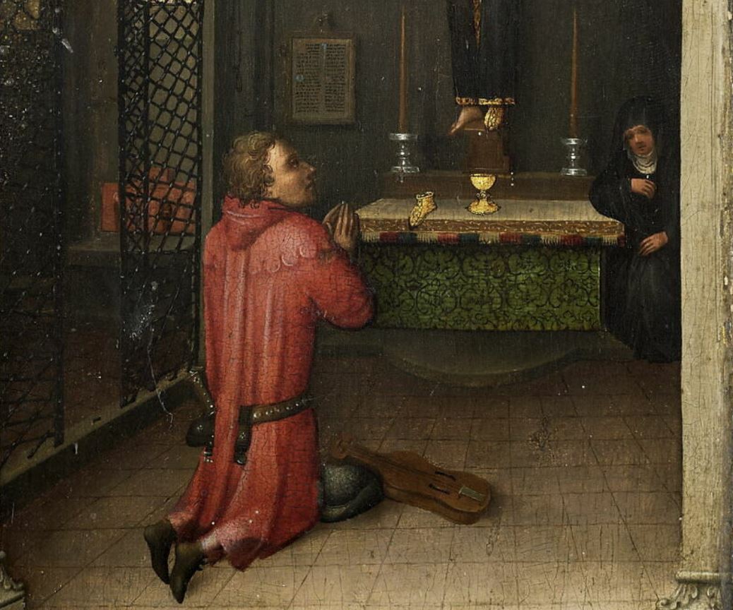 scène historique (église, intérieur, autel, arc en plein cintre, pilier, chapiteau, voûte, fenêtre, musicien, agenouillé, sculpture) ; sculpture (saint Voult, crucifiement)
