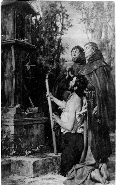 scène (dévotion, homme, agenouillé, chandelle : objet du culte, oratoire, religieux)