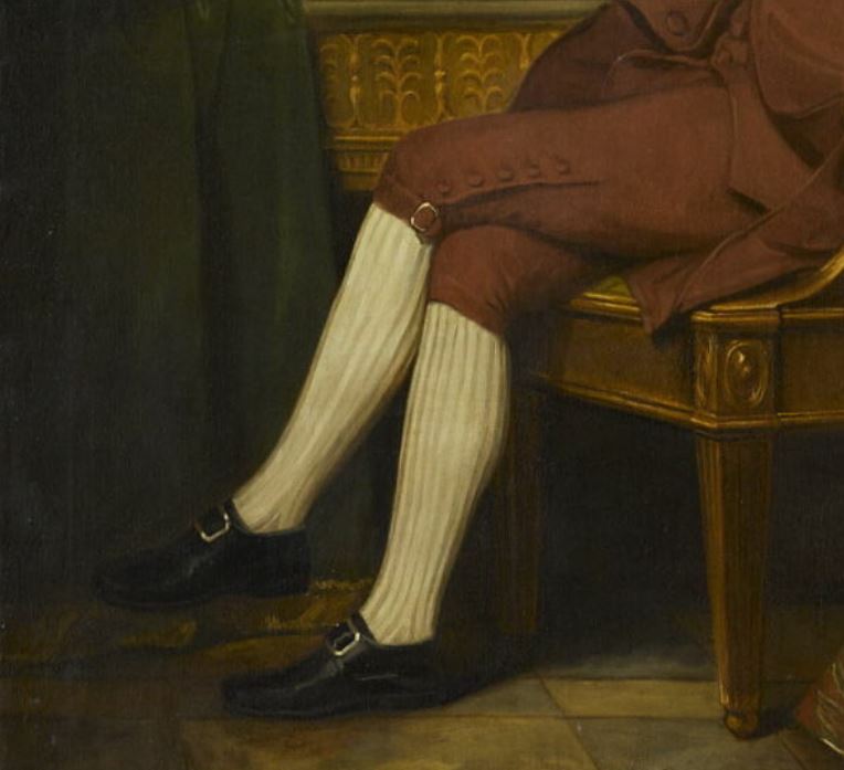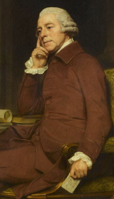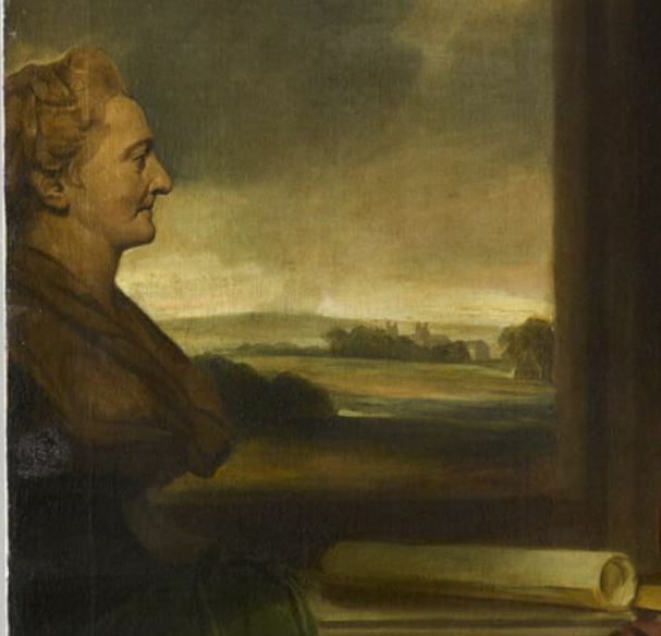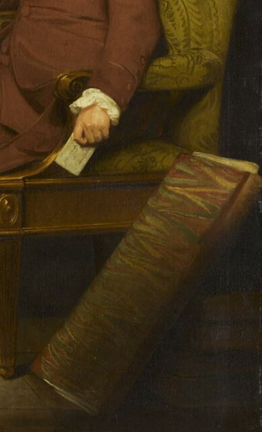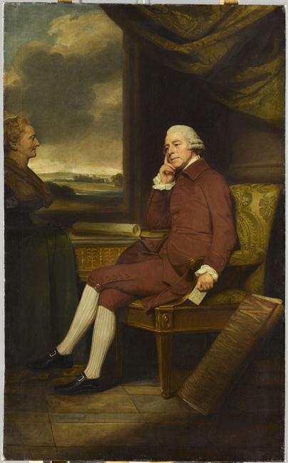 portrait (Willett Ralph, homme, assis, de profil, Anglais, amateur d'art, fauteuil, statue, lettre, draperie, colonne, fenêtre) ; fond de paysage
