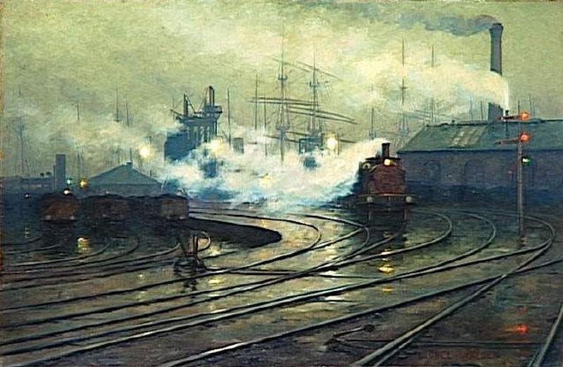 paysage (Cardiff, voie ferrée, locomotive, fumée, entrepôt, voilier, partie de, brouillard)