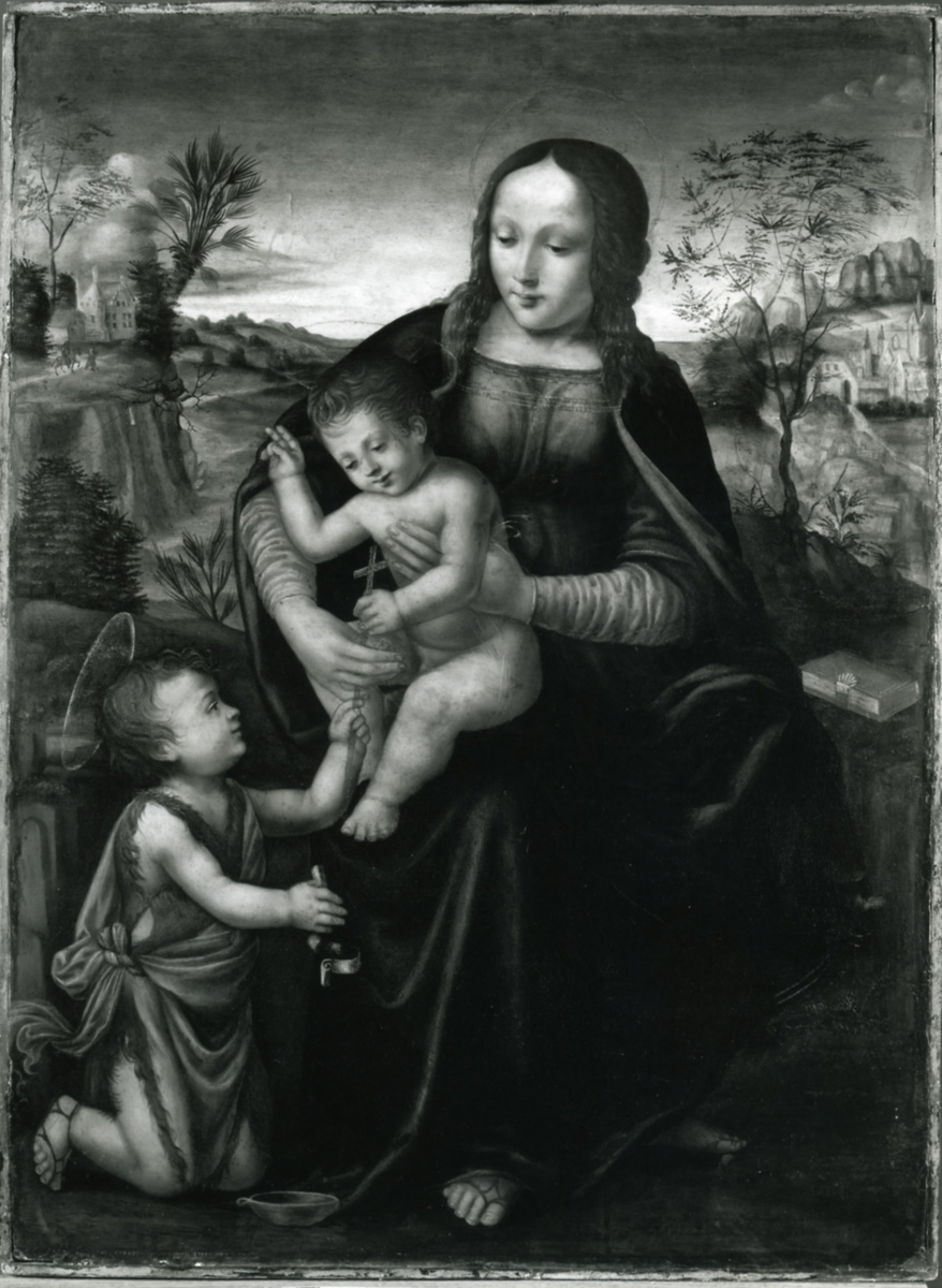 figures bibliques (Vierge à l'Enfant, saint Jean-Baptiste, livre) ; fond de paysage