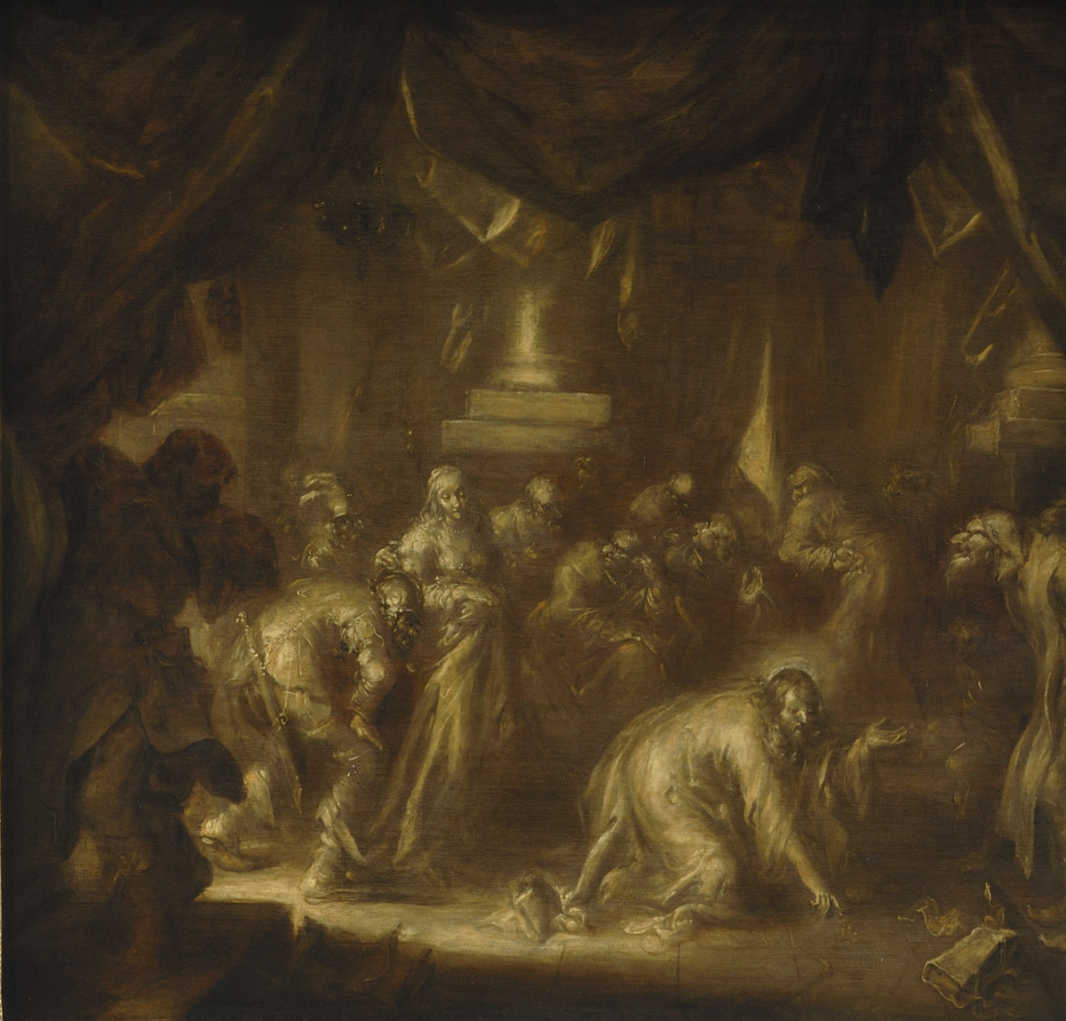 scène biblique (La femme adultère, draperie, socle, colonne, base)