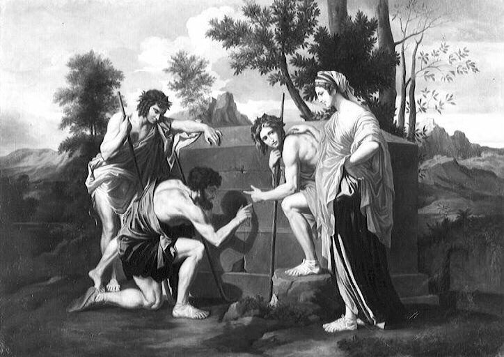 groupe de figures (à l'antique, femme, en pied, de profil, homme, agenouillé, de profil, homme, en pied, de profil, tombeau, montagne, Arcadie, Grèce)