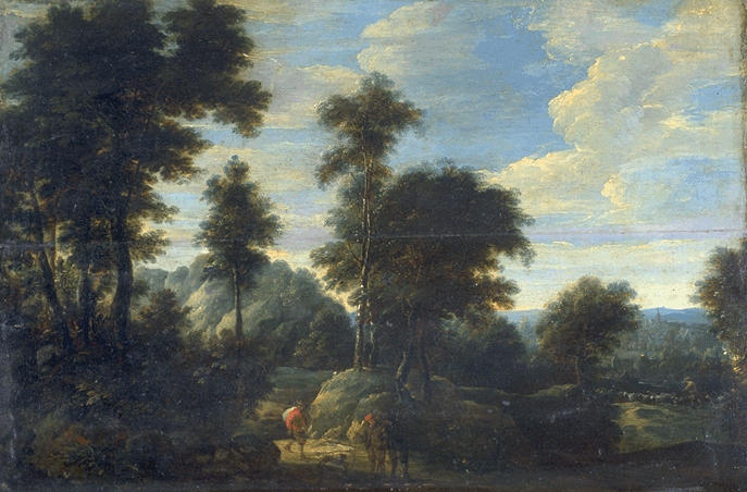 paysage (arbre, rocher, paysan, voyageur, garde : mouton, église)