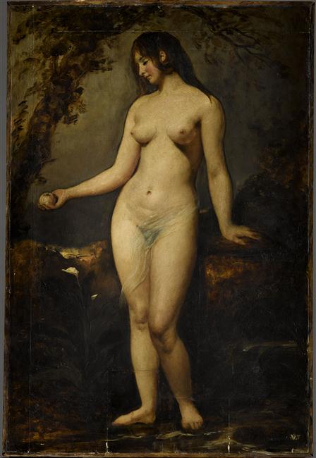 figure biblique (Eve : nu, pomme) ; fond de paysage