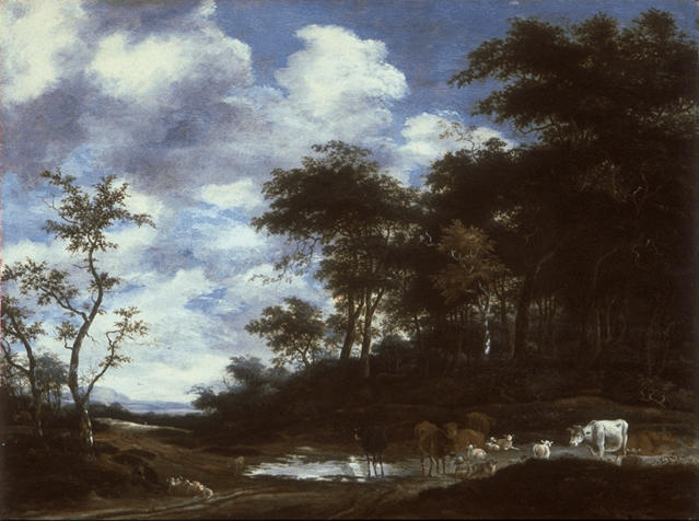 paysage (plaine, forêt, cours d'eau, vache, mouton, homme)