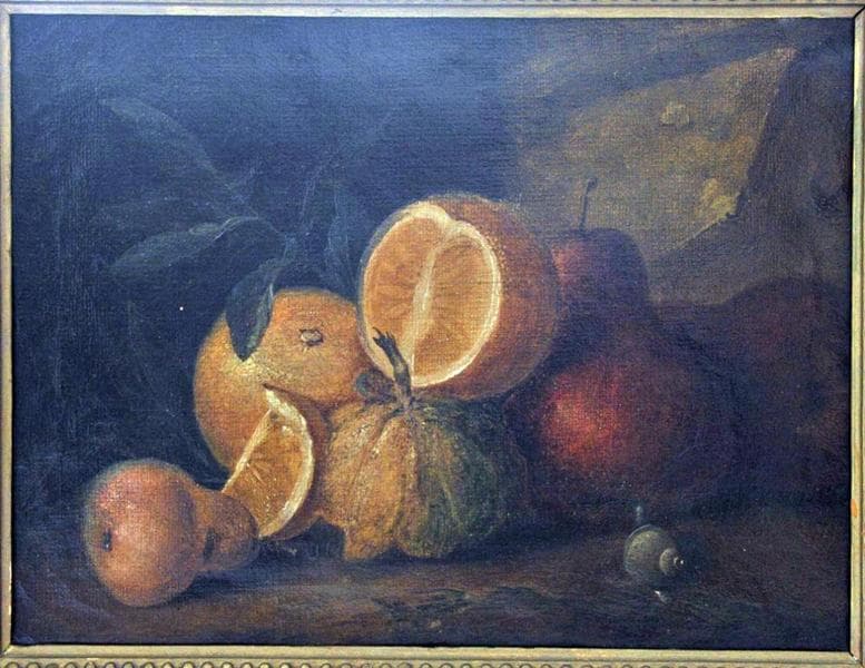 NATURE MORTE, POIRES, POMMES, ORANGES AVEC UN ESCARGOT