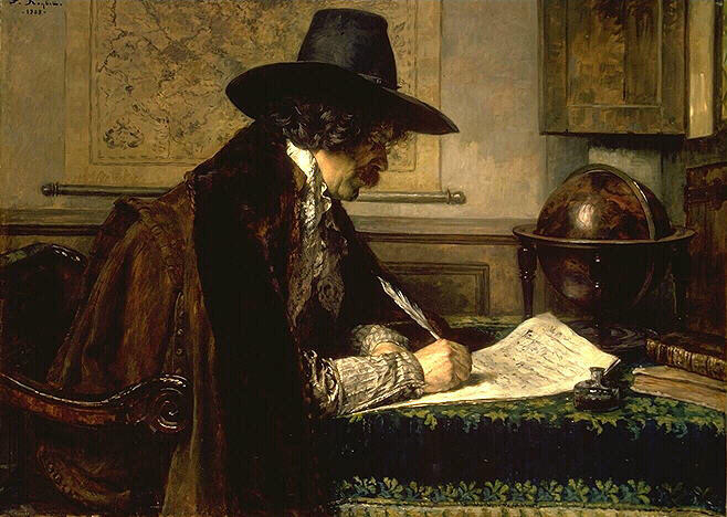 portrait d'inconnu (homme, assis, à mi-corps, de profil, écriture, instrument d'écriture : plume, encrier, sphère, carte, livre, chapeau)