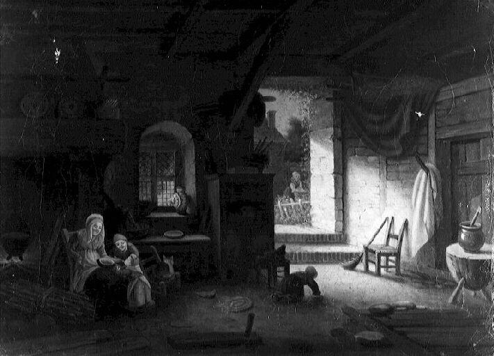 scène (repas, femme, enfant) ; vue d'intérieur (salle, âtre, marmite, mobilier, fenêtre, porte)