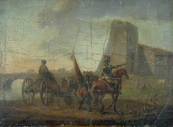 groupe de figures (cavalier, armure, charrette : cheval) ; fond de paysage (maison, cours d'eau, pont)