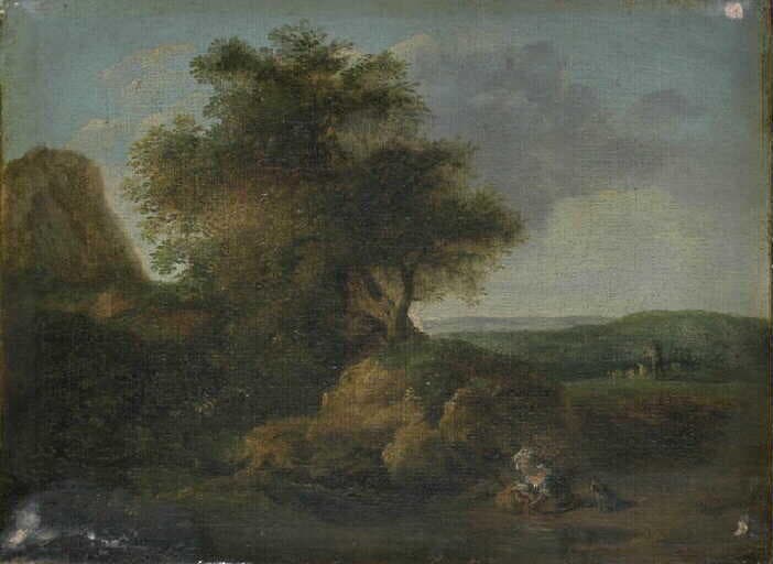 paysage (plaine, rocher, feuillu) ; femme ; assis