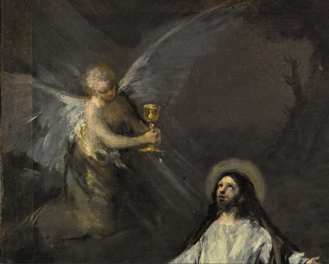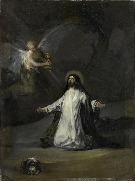 scène biblique (Agonie du Christ, Jardin des Oliviers, apparition, ange, calice, chien)