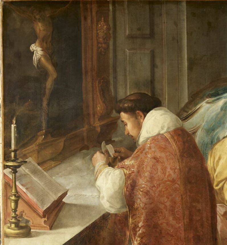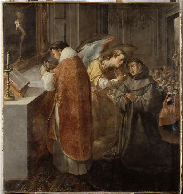 scène historique (saint Bonaventure, communion, ange, religieux, prêtre, autel, crucifix)
