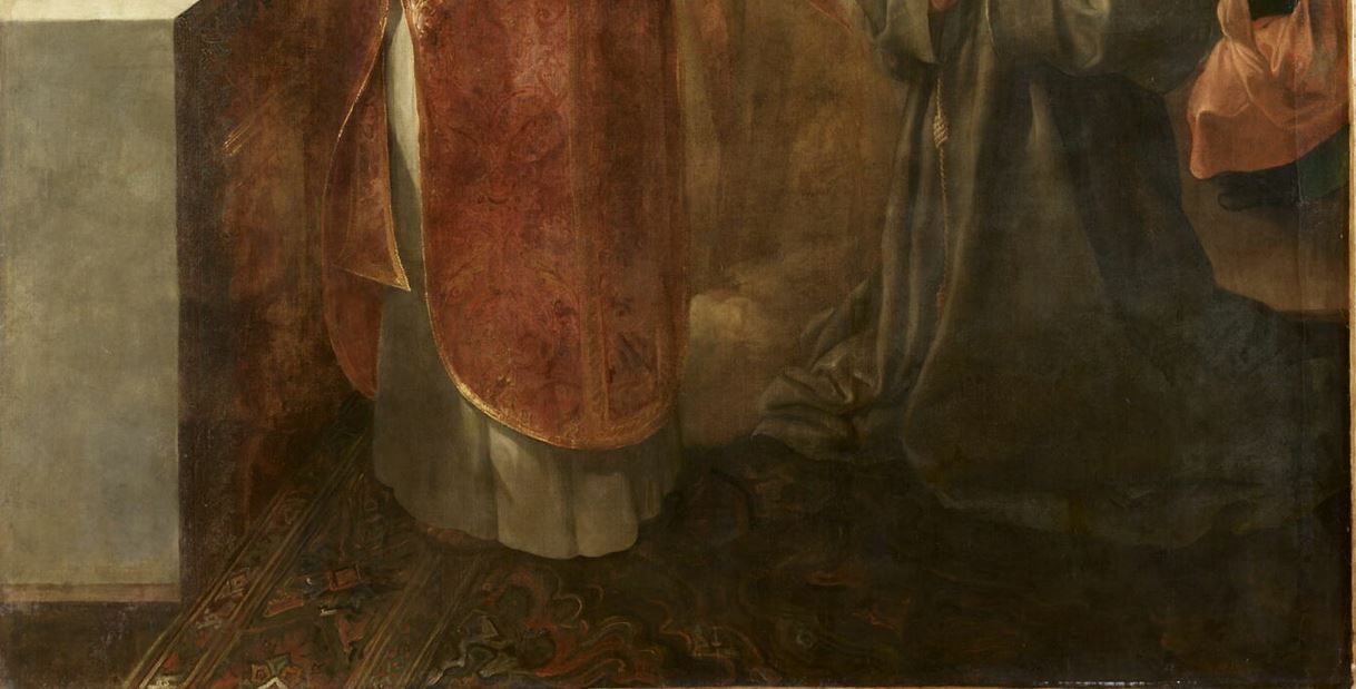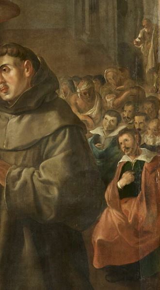 commandé en 1627 pour l'église du collège Saint-Bonaventure de Séville ; Zurbaran participa également à cette commande ; appartenait à une série de quatre compositions consacrées à la vie de saint Bonaventure : réception de saint Bonaventure dans l'ordre franciscain (Madrid, musée du Prado) , sainte Catherine apparaissant à la famille de saint Bonaventure (Greenville, Bob Jones university) , saint Bonaventure recevant la communion des mains d'un ange (Paris, musée du Louvre) ; numéro d'inventaire de l'autre élément : RF 1963 2