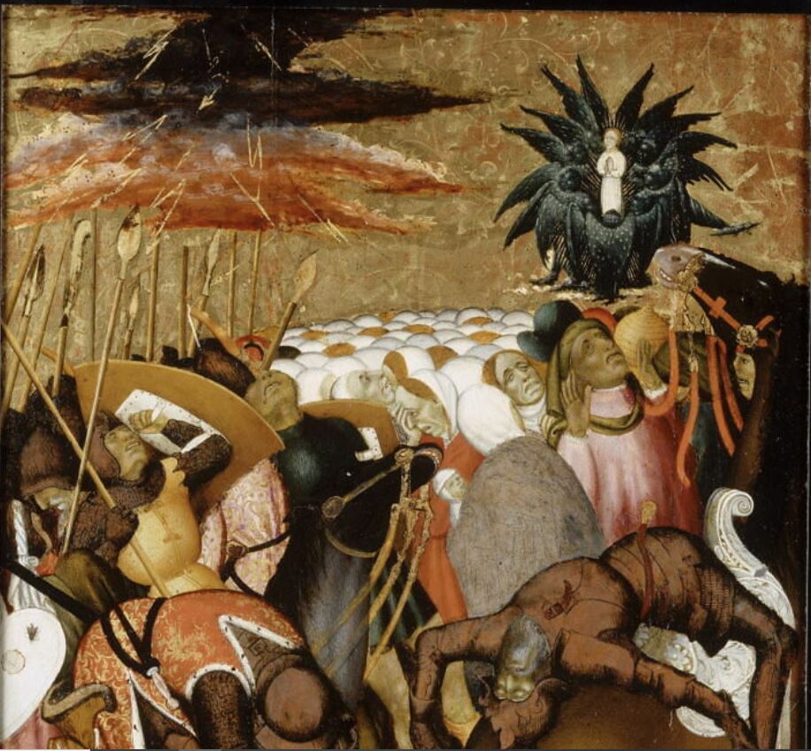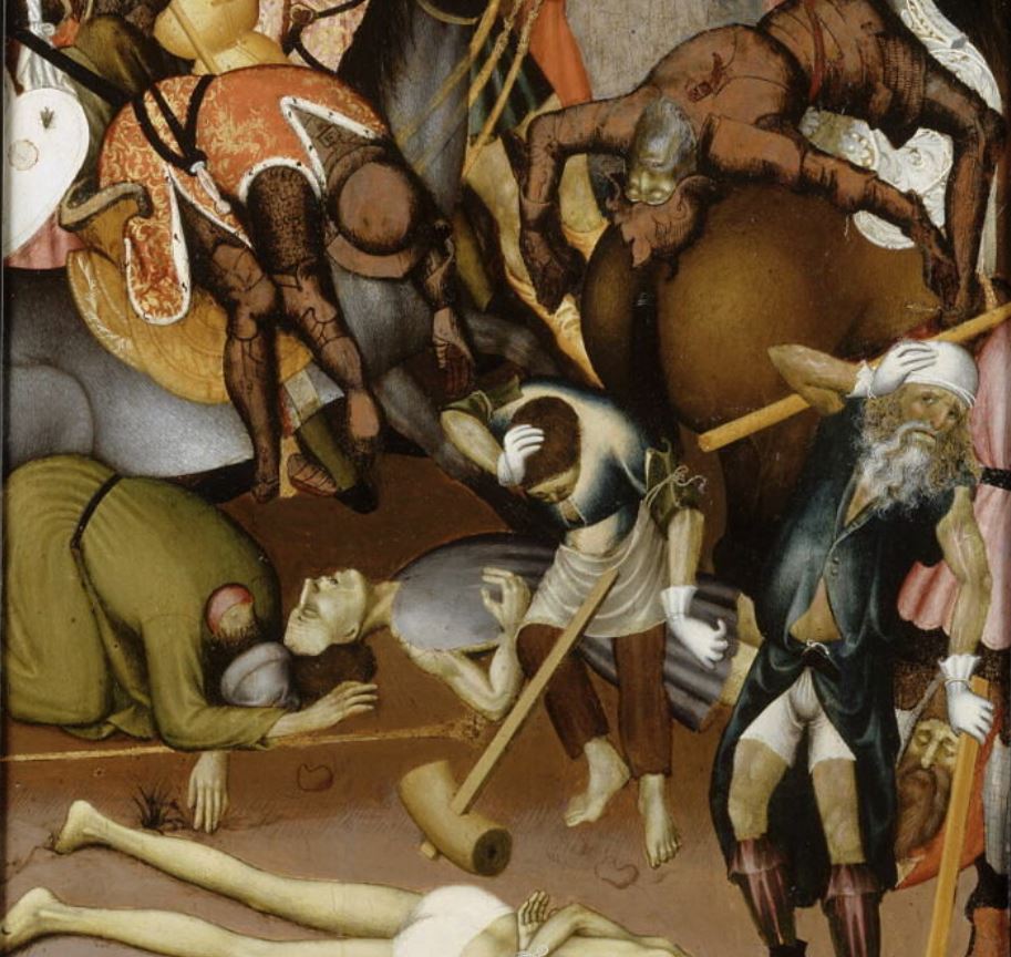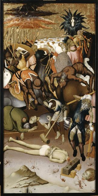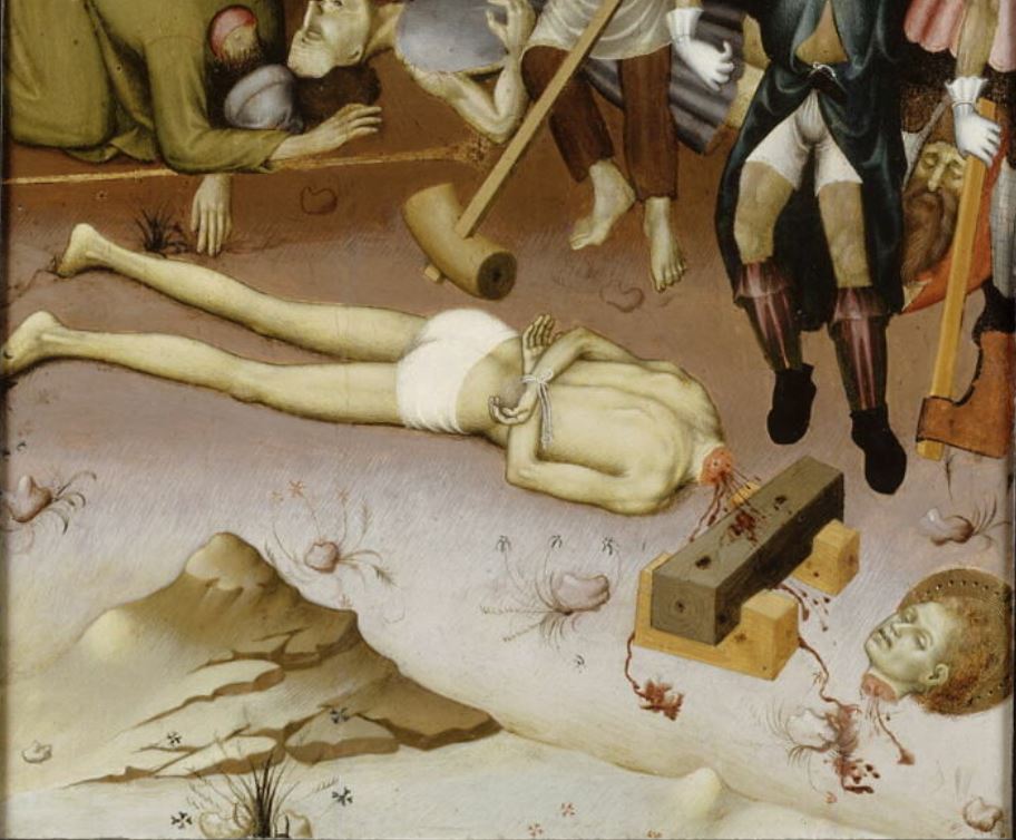 appartenait à un retable consacré à la légende de saint Georges ; le panneau central de ce retable serait saint Georges combattant le dragon, Chicago, art institute ; panneaux latéraux conservés au musée du Louvre à Paris : jugement de saint Georges, saint Georges traîné au supplice, flagellation de saint Georges ; numéros d'inventaire des autres éléments : RF 1571 à RF 1573