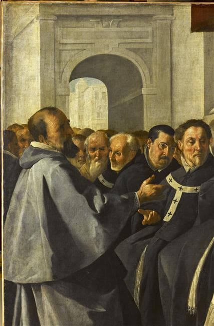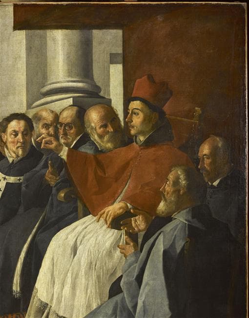 appartenait à une série destinée à l'église du collège Saint-Bonaventure de Séville, série commencée par Herrera en 1627 et complétée par quatre compositions de Zurbaran ; autres éléments, saint Bonaventure et l'ange (Dresde, musée, Frati 26) , saint Bonaventure et saint Thomas d'Acquin devant le crucifix (Berlin musée, perdu en 1945, Frati 25) , l'exposition du corps de saint Bonaventure (Paris, musée du Louvre, inv. MI 205)