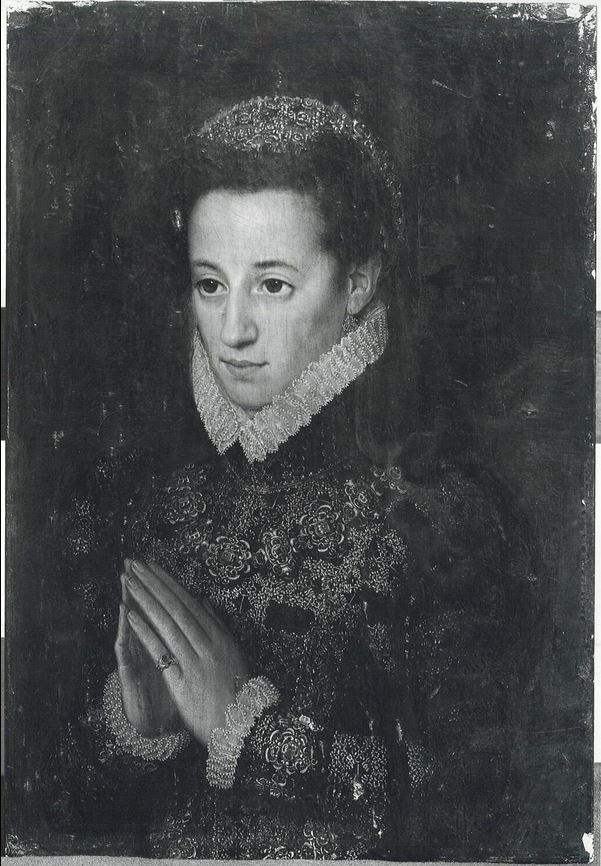 portrait d'inconnu (femme, en buste, de trois-quarts, prière, Espagnol, col : dentelle, bijou)