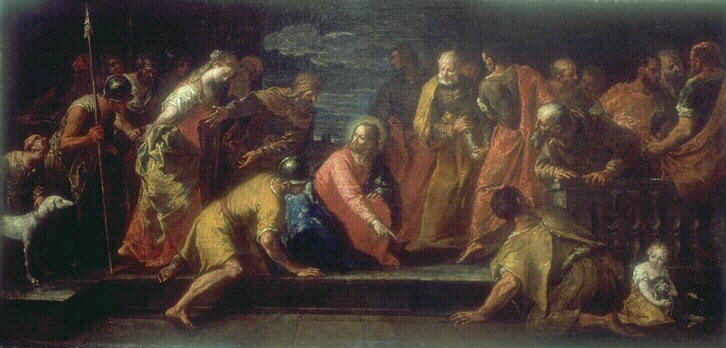 Le sujet de cette toile (Jean, IV, 8, 2-11) constitue un thème caractèristique de la peinture vénitienne du XVIème siècle dans les milieux perméables aux leçons du maniérisme (de Tintoret et de son cercle), plutôt que dans l'entourage de Véronèse (qui ne traita le sujet qu'une ou deux fois dans sa carrière), mais qui n'a jamais été décrit avec autant de profondeur que par Titien (pour qui ce ne fut pourtant pas un sujet de prédilection). L'oeuvre illustre le moment de stupeur muette ou le Christ écrit la célèbre sentance dans la poussière recouvrant les dalles du temple : 'Que celui de vous qui est sans péché lui jette la première pierre!', provoquant un mouvement général de curiosité inquiète vers son doigt tendu. L'auteur a puisé ici ses citations de Véronèse dans des compositions variées du maître, comme à droite la petite fille au chien imitée d'un motif de la version des 'Pélerins d'Emmaüs' conservée au musée Boymans-van Beuningen à Rotterdam (exactement la même attitude), ou, au premier plan à gauche, le personnage accroupi, ou encore le chien . La figure de femme adultère revêt, en revanche, un caractère nettement plus moderne évoquant le XVIIIème siècle. Ces citations nombreuses expliquent que les sources mentionnent pour ces deux panneaux une attribution à Véronèse, avec laquelle les oeuvres furent envoyées à Bordeaux, et que les rédacteurs des catalogues du musée aient ensuite donné les tableaux au maître lui-même à partir de 1832