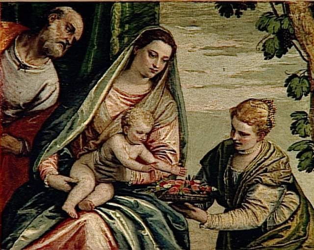SAINTE FAMILLE ET UNE SAINTE PRESENTANT DES FLEURS A JESUS