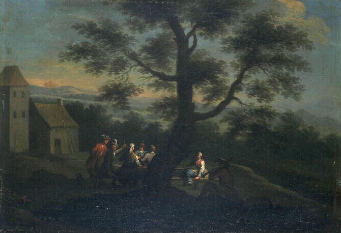 scène (divertissement, repas, clarinette, agriculteur) ; fond de paysage