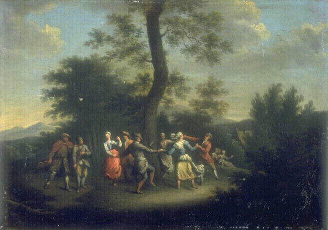 scène (danse, divertissement, agriculteur, violon) ; fond de paysage