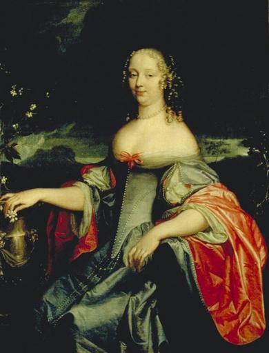 portrait d'inconnu (femme, à mi-corps, assis, de trois-quarts, vêtement : époque Louis XIV, fleur : oranger)