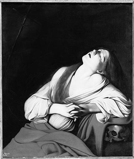 figure biblique (sainte Madeleine, à mi-corps, de trois-quarts, extase, crâne, effet de lumière)