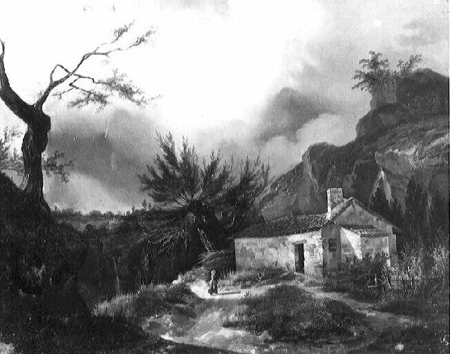 paysage (colline, feuillu, maison) ; femme