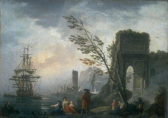paysage (bord de mer, rocher, voilier) ; marin pêcheur
